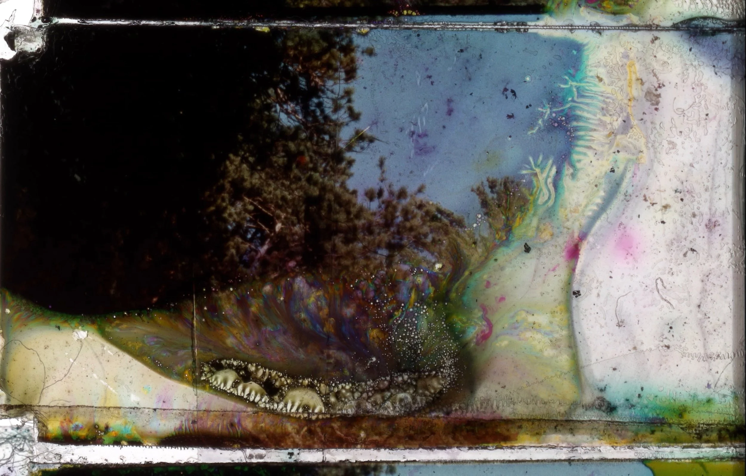 16mm and Super 8 Film Digital Transfer, freestanding screens, various objects: painted and shaped clay, water, jars, mirror, pomegranate, synthetic fabric, 4 min.; 4 mono channels, speakers, music composer: Émilie Payeur.